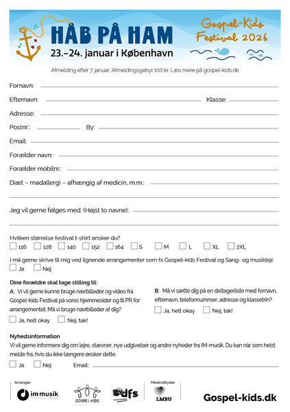 Hvis du har aftalt med din leder, at gruppen/kirken/klubben skal betale for dig, er der et felt på tilmeldingen, hvor du kan skrive navn, adresse og mailadresse på den, som skal betale, så mailer vi din faktura til personen.